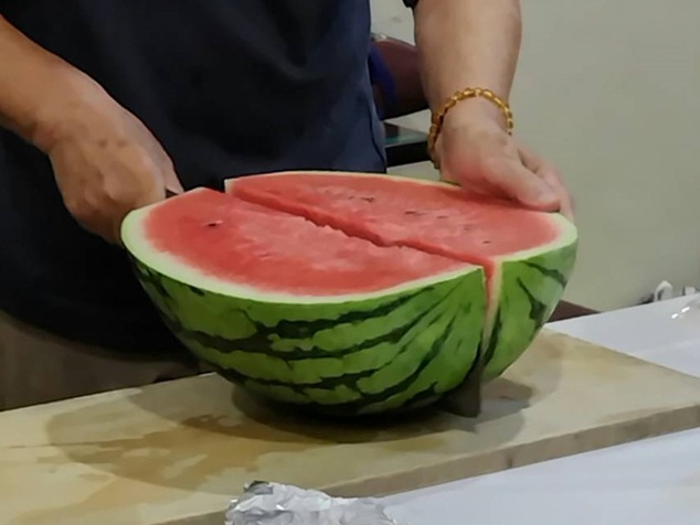 丸ごと届いたスイカは刃渡り40cmの大きな菜切包丁(私物)が必要なほど大きかったです。