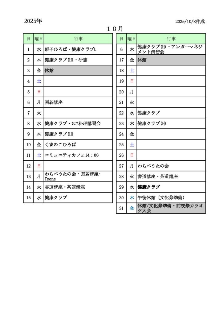 境南コミセン月間スケジュール(令和7年10月) 2025年10月11日 最終更新日時 : 2025年10月11日 サイト管理人 FacebooktwitterHatenaCopy FacebooktwitterHatenaCopy
