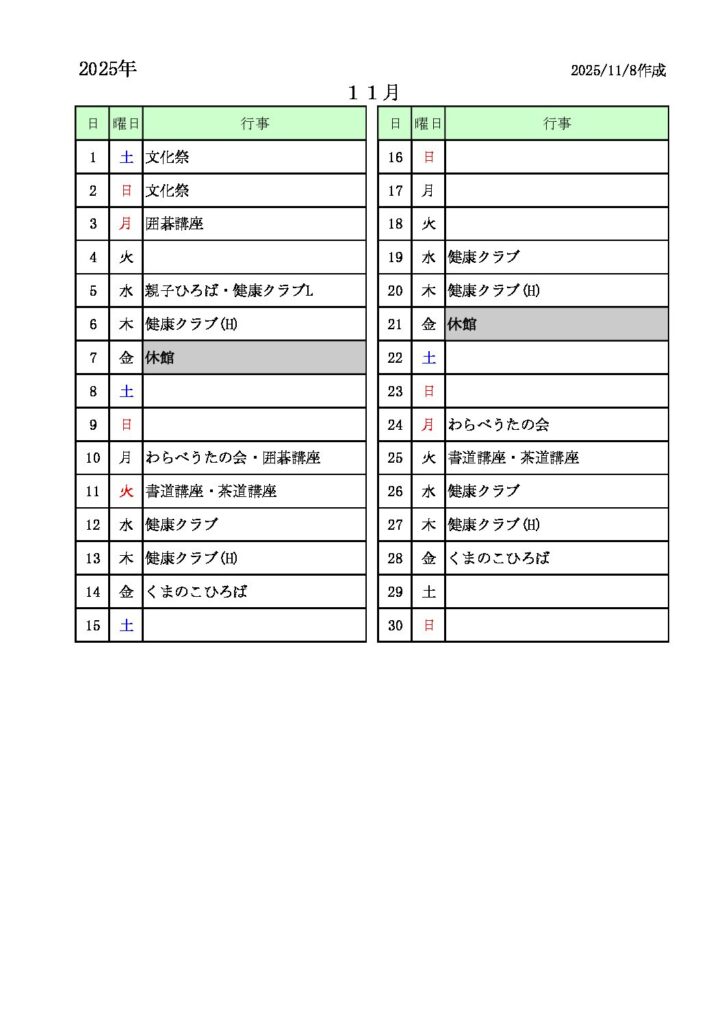 境南コミセン月間スケジュール(令和7年11月)