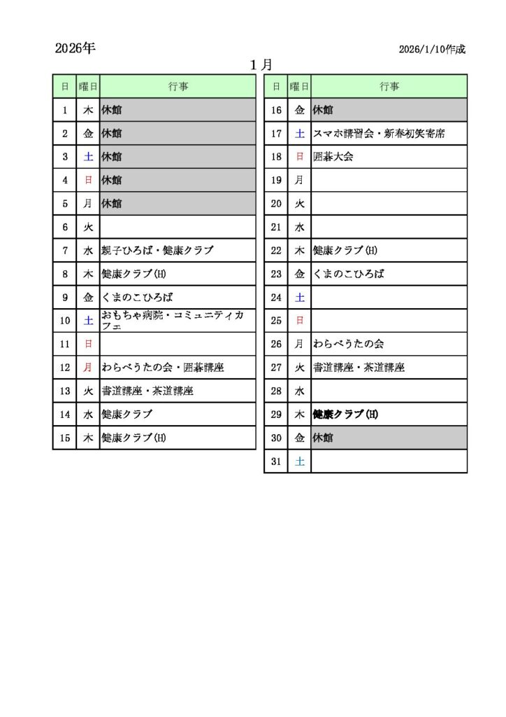 境南コミセン月間スケジュール(令和8年1月) 2026年1月11日 最終更新日時 : 2026年1月11日 サイト管理人 FacebooktwitterHatenaCopy FacebooktwitterHatenaCopy